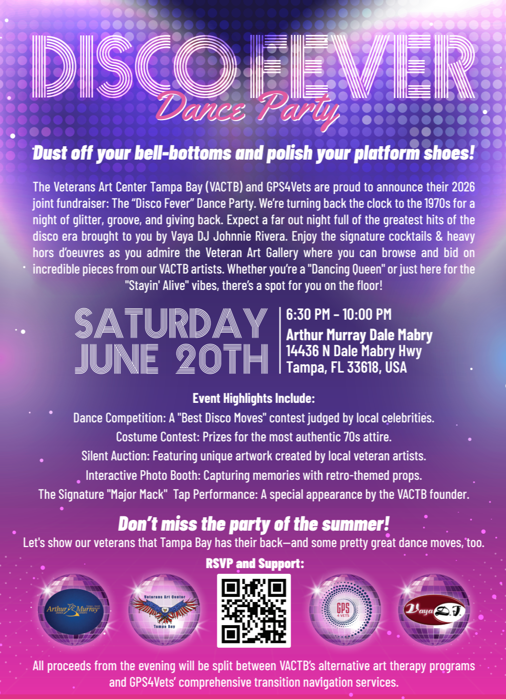TAMPA BAY, FL – Dust off your bell-bottoms and polish your platform shoes! The Veterans Art Center Tampa Bay (VACTB) and GPS4Vets are proud to announce their 2026 joint fundraiser: The “Disco Fever” Dance Party. This high-energy event will take place on Saturday, June 20 2026, bringing the community together to support mental health, career transition, and artistic healing for Florida’s veteran population.
